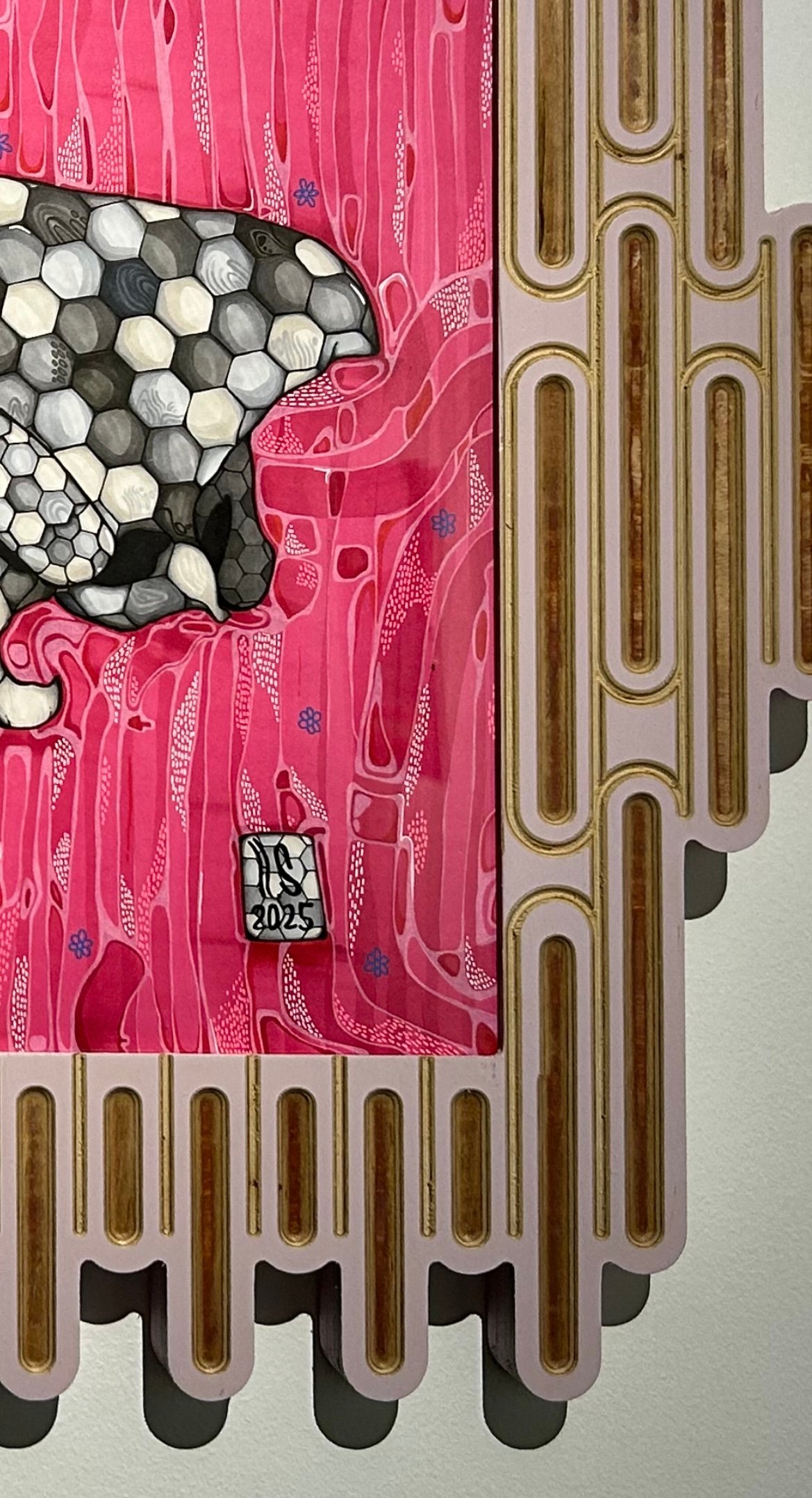 This is the original 1/1 Florida Black Wolf skull portrait in a custom frame by Luke Jenkins; CNC-carved wooden frame with variable dimensions.